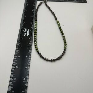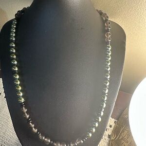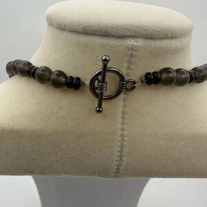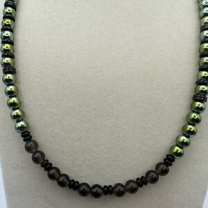 Handcrafted beaded necklace with green hematite and smoky quartz beads with black onyx spacers. Necklace is approx 16” long with toggle clasp. Can be changed to a lobster clasp with extender if an interested party wants more length.