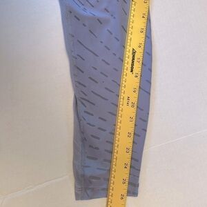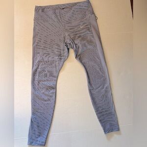Nike Dri Fit Division fast leggings. Mid rise 80% polyester 20% spandex with back zipper pocket in lilac color almost silver like. Pre owned great condition.