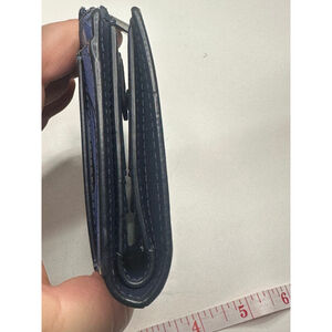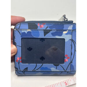 This is a pre-owned Kate Spade bifold wallet featuring a blue floral pattern with pink accents. The exterior has a textured finish and includes a clear ID window on the back. The wallet secures with a snap closure and has an additional zippered compartment. The interior is a solid navy blue with multiple card slots and a billfold area. Visible wear includes some creasing on the edges and minor scuffing on the metal zipper pull. The wallet measures approximately 4.5 inches wide.