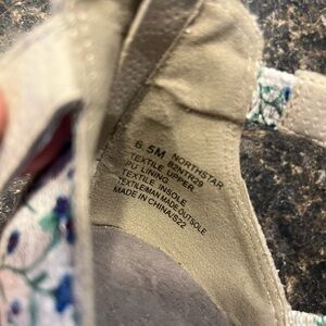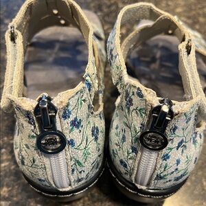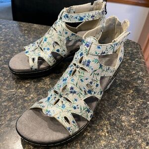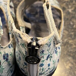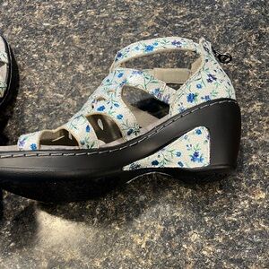 JBU Jambu Northstar Laser-Cut Floral Pattern Wedge Sandals in the Ditzy Floral colors of White Blue Green & Purple. Size 6.5. Insoles are cushioned memory foam. These feature an adjustable hook and loop Velcro ankle strap and a metal zipper on the back for easy on and off. Man made faux leather uppers. Never worn, BUT PLEASE CHECK OUT LAST PICTURE FOR AREA AROUND ZIPPER! IT’S NOT PERFECT! Cute as can be!! Dressy or casual.