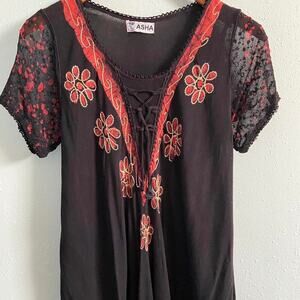 Black and red floral print boho hippie dress