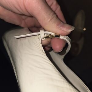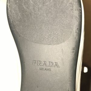 Stylish Prada Mary Jane flats in glossy white. Features a classic strap and logo detail.