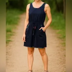 Dress features vibrant trim and Sleeveless design. Thick elastic waistband with adjustable draw string. Light, cool fabric.