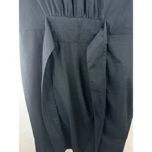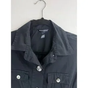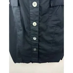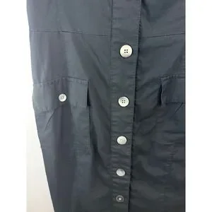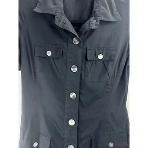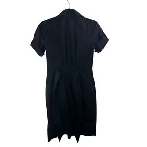 Banana Republic black utility shirt dress features a classic button-down front and a matching removable waist tie for a defined silhouette. Designed with functional cargo-style chest and hip pockets, it also includes short sleeves with button-tab details for an adjustable look. The crisp cotton-blend fabric and pointed collar offer a polished, safari-inspired aesthetic suitable for professional or casual wear.
