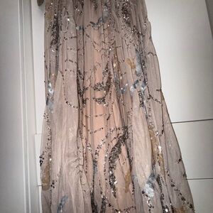 Shine in this elegant cream gown adorned with shimmering sequins. Perfect for special occasions, this dress offers a sophisticated and glamorous look.
