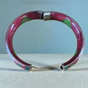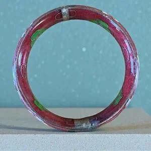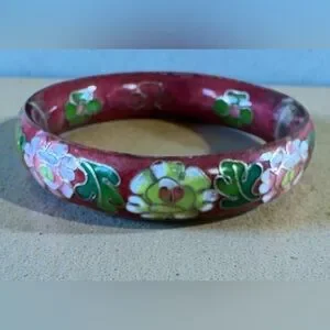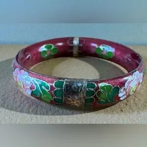 Beautiful vintage painted metal bangle. Floral with colors of white, green, and mauve.