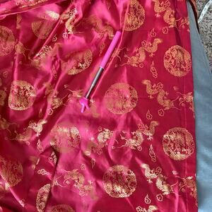 Beautiful vintage-inspired long robe in rich red and gold with traditional dragon and medallion motif throughout. Outer layer is deep cherry red (SILK?) the Chinese characters say silk and to dry clean - with golden woven embroidery, inner layer is shimmering orange-gold with red dragon motifs. Kimono style with wide sleeves, matching tie belt, and open front. Labeled size L. Fabric feels like silk blend (tag says “Silk MPL”), lightweight and fluid. Ideal for loungewear, cosplay, or as a statement layering piece.