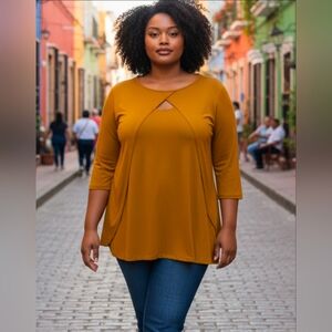 The Denim 24/7 Women's Front Drape, Keyhole Front tunic in size 1X is a stylish and comfortable top perfect for travel and casual occasions. Made from a blend of spandex and rayon, this mustard-colored blouse features a round neck, 3/4 sleeves, and a relaxed fit. It is machine washable and easy to care for, making it a convenient and lightweight option for the summer, fall, and spring seasons. The tunic's unique front drape and keyhole front add a touch of flair to this solid patterned top, making it a versatile addition to any woman's wardrob
