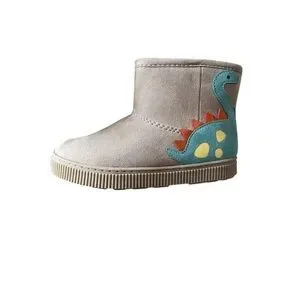 Adorable kids boots with a dinosaur design. Beige with blue and orange accents.