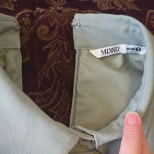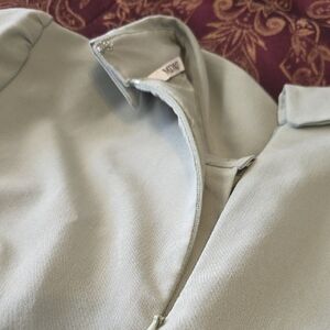 Stylish green pleated dress with cute button up collar is paired with white sneakers, sneakers not for sale. Skirt has a lining built in, comfy and stylish. Zippered back, hook closure and tie waist.
