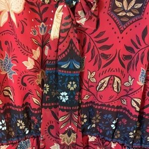 Vibrant red dress with floral pattern. Features purple accents. Long sleeves and tie neckline. Perfect for casual outings.
