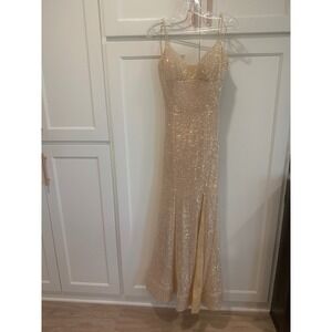 Keywords: Sherri Hill dress, sequin gown, prom dress, formal dress, evening gown, open back dress, slit dress, gold dress, beige dress, size 8 dress, spaghetti strap dress, special occasion dress, pageant dress, party dress, maxi dress