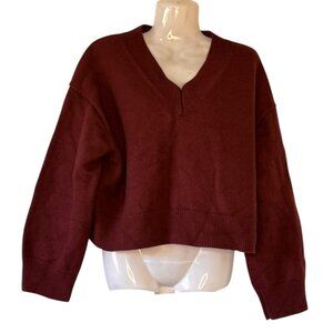 Babaton by Aritzia Wren Excellent Condition Women's 100% Wool Sweater Burgundy Color with V-Neck and Voluminous Sleeves has Dropped Shoulder Cropped and Boxy Heavy Weight Heather Cardamon Oversized and Slouchy Dark Academia Preppy Lagenlook Jewel Tone Minimalist Soft Warm Winter Country Club Oxford