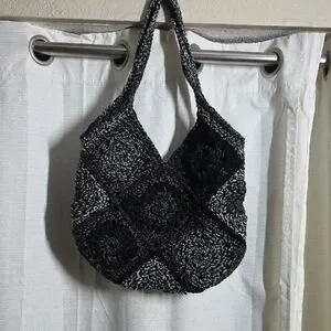 This stylish handmade crochet bag features a sophisticated black and gray design, perfect for any occasion. Its unique pattern adds a touch of elegance to your outfit. interior features purple color with Disney's cruella deville