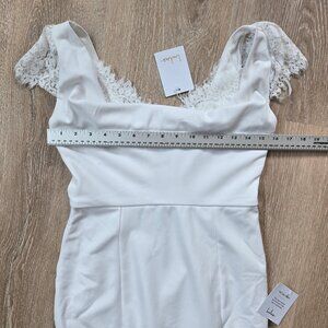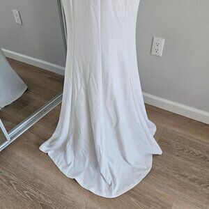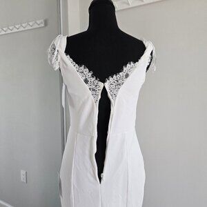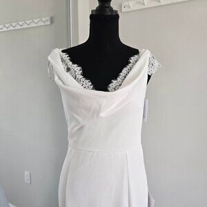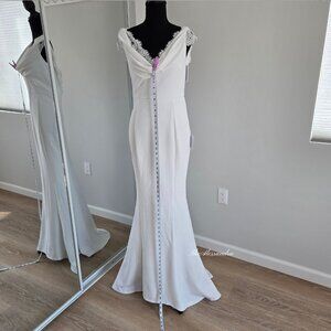 White mermaid maxi dress with lace cap sleeves and a clean, sculpted silhouette. Made from stretchy techno-crepe that holds shape while remaining comfortable. The bodice features a soft cowl neckline with a lace inset, paired with sheer eyelash lace cap sleeves. Back has a deep V with matching lace trim. Fitted waist flows into a classic mermaid skirt with a sweeping hem.
