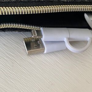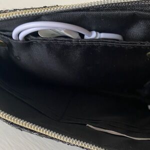 Keep your phone charged and your outfit sparkling! This stunning Liz Claiborne wristlet features a shimmering black glitter finish and a hidden built-in power bank to charge your devices on the go.