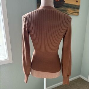 Ribbed and compact, this button-front cardigan gives an elevated twist to a closet staple with its slim fit and elegant blouson sleeves. Perfect for easy, everyday styling.