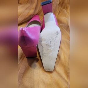 Anne Klein Metallic Pink Heels. Has a flattened rectangular 3 inch heel with a slightly pointed but rounded toe. These would be perfect for springtime, some cushioning and looks to have been walked in once.