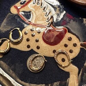 Closet sale (2) pairs of gold hoop earrings (1)pair is 14k gold hoop earrings with white gold and yellow gold (1)pair of hoop earrings 10 k gold trigold Greek key hoop earrings with rose,yellow and white gold hoop earrings Both are dime sized in good condition