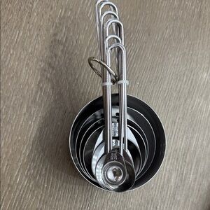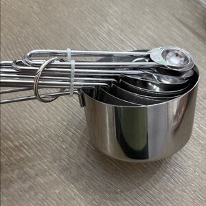 Wooden spoon with metal measuring cups. Perfect for cooking and baking.