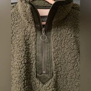 Cozy sherpa hoodie. Half-zip front. Olive green color. Perfect for layering.