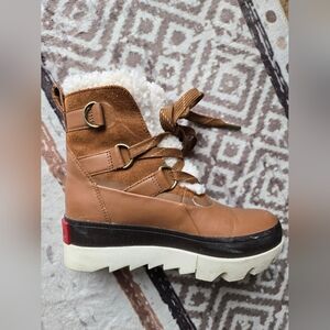Stylish winter boots with a cozy lining. Durable brown leather. Cream accents for contrast. Perfect for cold weather.