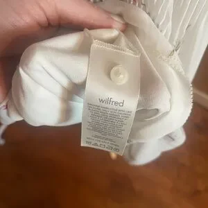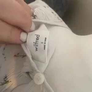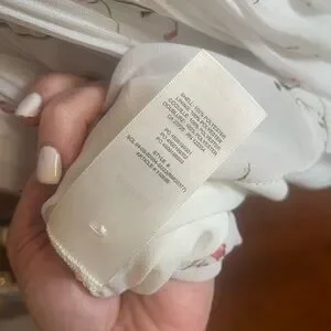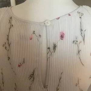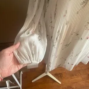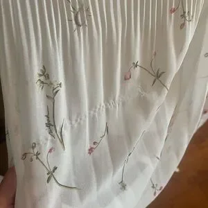 Chic white dress with delicate floral accents. Features a stylish pleated design. Small snag on front as photographed. Hardly visible due to the pleated design