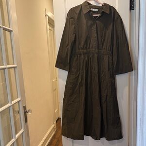 Elegant dark khaki polyamide midi dress. Features a classic collar, button-down front, and elastic waistband. Perfect for any occasion.