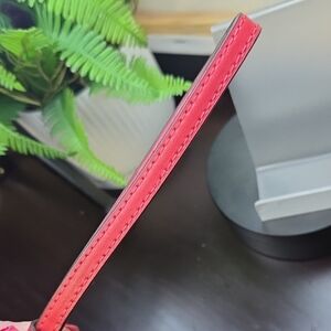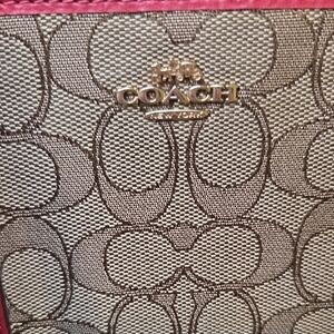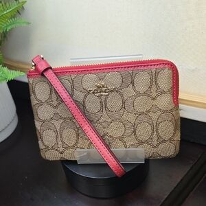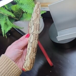 Chic Coach wristlet with signature pattern. Rich brown with bold red trim. Ideal for versatile style. In excellent condition, no rips tears or stains, all corners are great too.