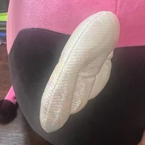 Charming pink cow plush featuring a heart and cute wings. Contrasting black patches add a playful touch.