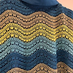 Chic dress with a multicolor wave design. Features a stylish collar and zip detail.