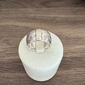 Stylish silver ring by Coach. Features elegant engraved patterns. Perfect for any occasion.