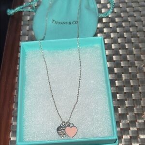 Chic silver necklace with dual heart charms. One heart in soft pink. Ideal for everyday elegance. Ornament .5 length .5 width. Marks 925,Designer Signature Tiffany & Co. Total weight 2.6 Non Gem Material Enamel.