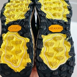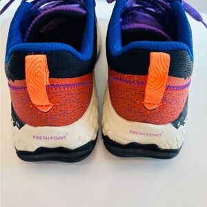 Colorful sneakers with purple and blue design. Features orange and yellow accents. Comfortable and stylish for active adults. Size 8.5. Fresh Foam Hierro. Toe Protect.