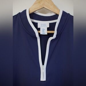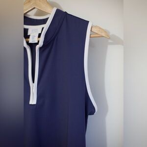 Chic, minimal sleeveless top by Sigrid Olsen with a sporty-polished feel. Deep navy blue with crisp white trim and a functional zip neckline that can be worn zipped or slightly open for an effortless look.