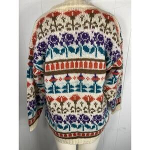Vintage Fair Isle knit sweater with an eye-catching Nordic floral pattern 🧶❄️ Cream base with bold red, teal, purple, and brown details throughout. Cozy medium-weight knit with a classic crew neckline and relaxed fit — perfect for layering in fall and winter. Gives total cottagecore / ski lodge / retro grandma-core energy. Super unique statement piece you won’t find twice.
