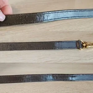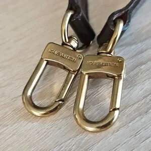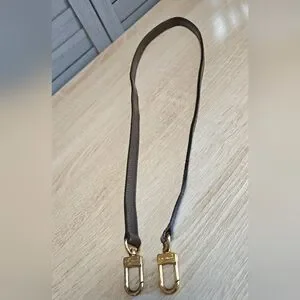 Louis Vuitton vachetta leather painted brown. Brass snap hooks. Strap is in terrible condition. Snap hooks are beautiful.