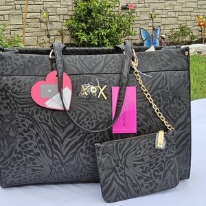 Stylish Betsey Johnson tote bag. Features black and gray animal print. Includes gold chain and logo accents. Comes with matching pouch.
