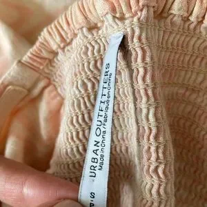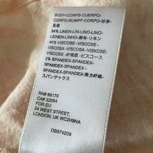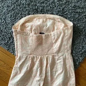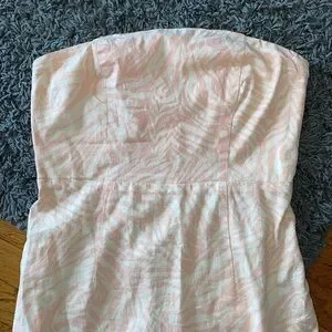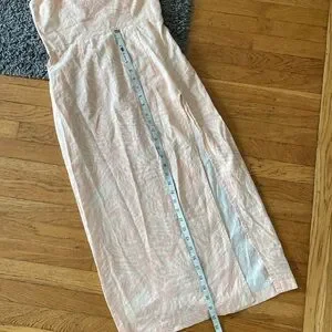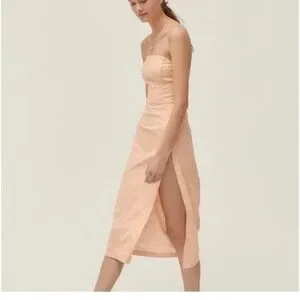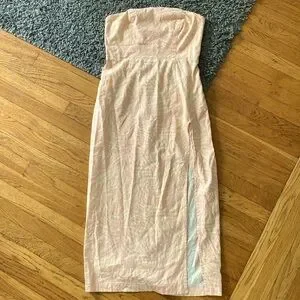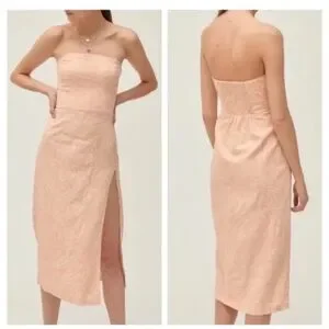 Beautiful linen-blend Midi Dress from Urban Outfitters. This dress has a silicone rubberized grip strip across the bust (on the inside) to keep it in place. Side-slit Midi length Colors: blush pink and cream Soft and subtle zebra/swirl pattern
