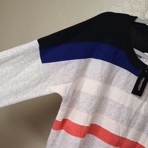 Chic crewneck sweater with vibrant stripes. Features black, blue, white, and dark pink(coral) strips. Ideal for casual outings. Non-smoking home with cat and dogs. No rips or stains or holes. See pictures for description and measurements and condition. Soft 100% cashmere.