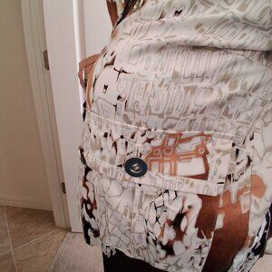 This stylish and versatile JUSTB top can be worn as a lightweight shirt or a jacket. It features a unique, eye-catching abstract cityscape or architectural print in neutral tones of tan, brown, white, and black.