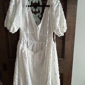 Floral white dress featuring a textured floral design and puffy sleeves. Looks like a wedding cake ! Babydoll style.. Scalloped hemline. Perfect for wedding shower or reception.