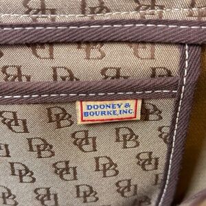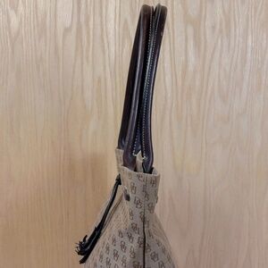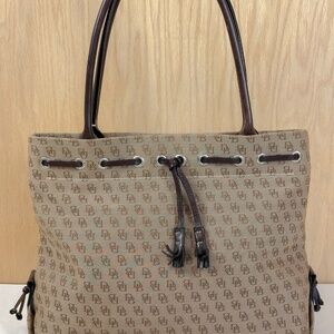 Classic and stylish Dooney & Bourke Tote featuring the signature DB monogram print in a neutral canvas with rich brown leather and dual shoulder straps. Accented with leather tassels and grommet drawstring detail for added charm.