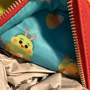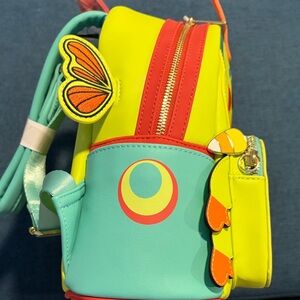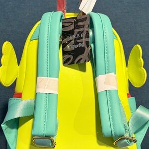 Adorable Loungefly mini bag with a Pixar character design. Bright yellow with orange accents. Ideal for carrying small essentials.