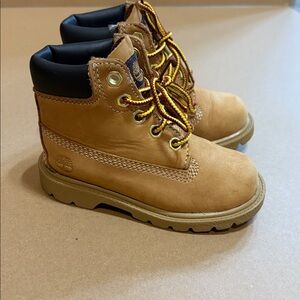 Stylish Timberland boots for toddlers. Tan leather with dark brown collar. Durable and comfortable. Perfect for outdoor adventures. In great condition, ready to ship same business day, smoke free!