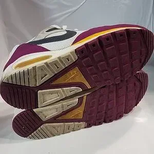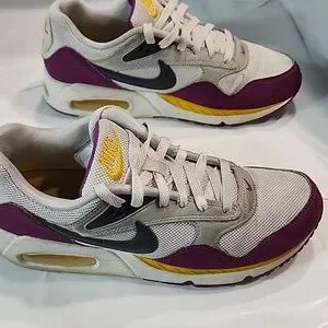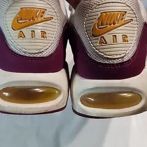 Nike shoes with cream mesh and purple overlays. Black swoosh and yellow accents.