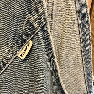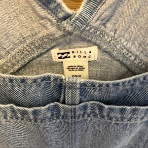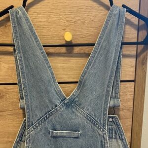 Stylish denim overalls. Features adjustable straps. Front pocket detail.
