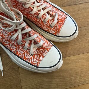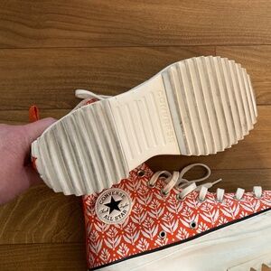 The Converse Run Star Hi (171922C) High Summer Spirit Bright Poppy Sneakers in size Womens 10.5 / Mens 9 are a colorful and stylish choice for any season. With a platform sole, round toe, lace-up closure, and high-top style, these sneakers offer both comfort and breathability. The orange floral pattern and star theme add a fun and vibrant touch to the design. Made with a durable rubber outsole and cushioned insole, these sneakers are ideal for keeping your feet comfortable and supported during all your summer adventures.