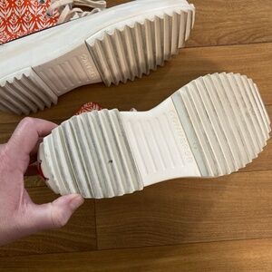 Good pre-loved condition with a small amount of light marking on the soles. Color: Bright Poppy/Egret/Black.