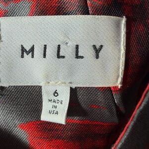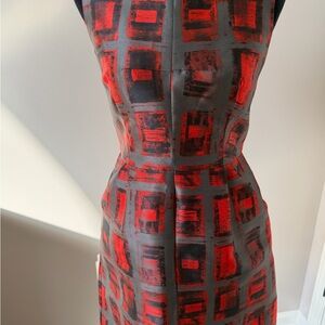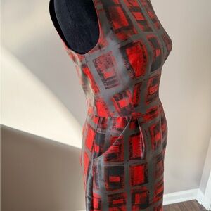 This Milly sleeveless dress in size 6 is a boutique-quality standout that effortlessly blends modern sophistication with chic, wearable style. The dress features a vibrant red and soft gray geometric print, creating visual interest and a flattering, figure-enhancing look. Crafted with quality boutique construction, it drapes beautifully while maintaining structure. The chunky exposed zipper down the back adds a bold, contemporary touch, making this dress a statement piece from every angle. With a pit-to-pit measurement of 17" and a 35" length, it hits just above the knee, offering a tailored yet comfortable fit.